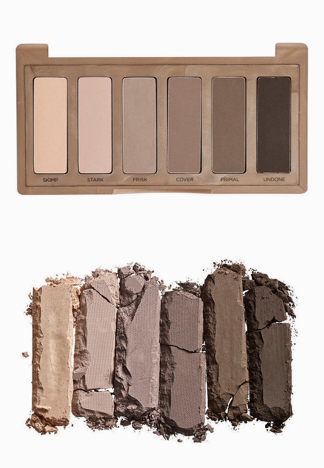 De zes kleuren zijn Skimp, Stark, Frisk, Cover, Primal en Undone. Welke van deze zes ooit al te zien was, weet ik niet. In ieder geval zit geen van deze kleuren in één van de Naked palettes en is ook niet verkrijgbaar als single. Elke kleur bevat 1.3g, dit is evenveel als in een Naked palette.